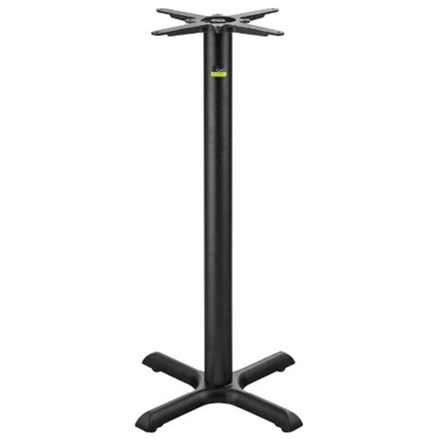 Type: Bar-height self-leveling table base. Finish: Textured black. Column: 3 inch round. Footprint: 22 in × 22 in cross style. Technology: FLAT PAD hydraulic. Recommended top size: Up to 24 inches square or 26 inches round. Best for: Bars, cafés, and high-top sections.