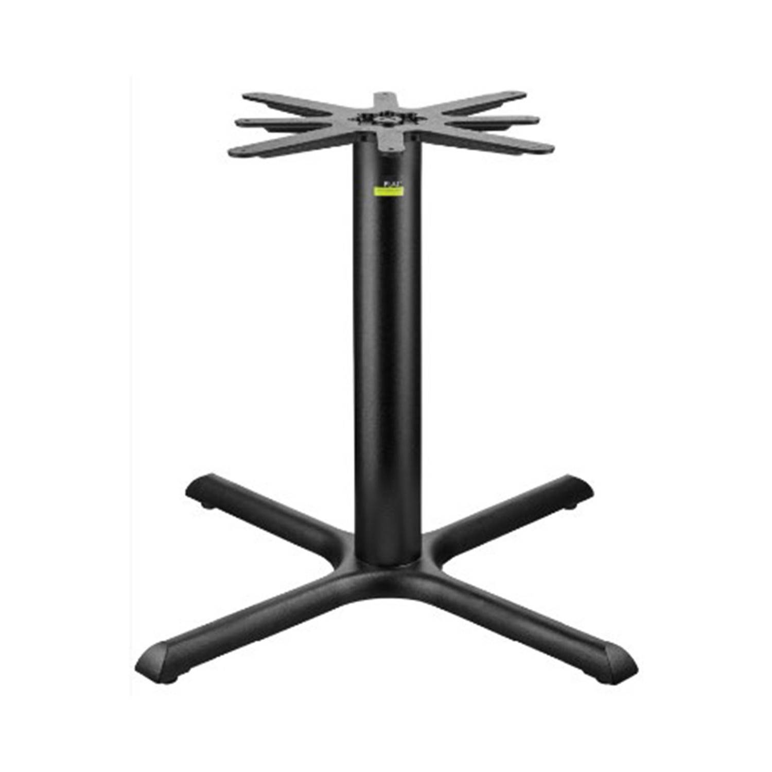 Type: Large self-leveling base. Finish: Textured black. Column: 4 inch round. Footprint: 36 × 36 inches. Construction: Cast iron. Technology: FLAT PAD hydraulic leveling. Top size: Up to 60″ round or 47″ square. Best for: Large dining layouts or tables joined together for bigger parties.