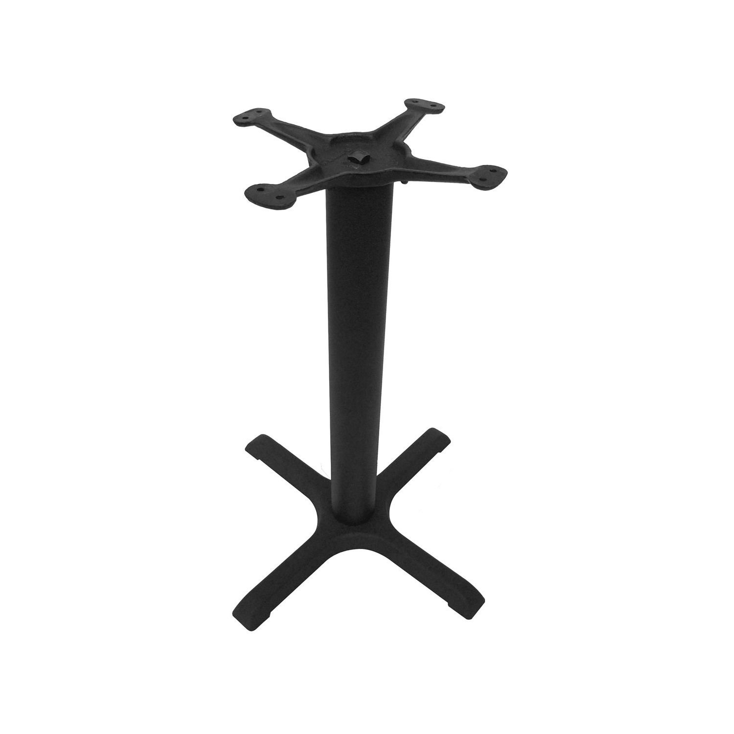 Overall height measures 28.25 inches for standard dining. The cast-iron plate covers about 22 by 22 inches. A 3 inch diameter steel column ties the system together. The TP12 spider spans about 13 inches with slotted holes. Slots accept common restaurant fastener patterns with ease. Adjustable plastic glides sit under each prong. Through bolts clamp joints with dependable force. Threadlocker helps resist loosening during turn cycles. The coating is a textured black powder finish. On problem floors, a self leveling aid like CT2059 can tame grout lines. Everything supports fast installs and steady service life.