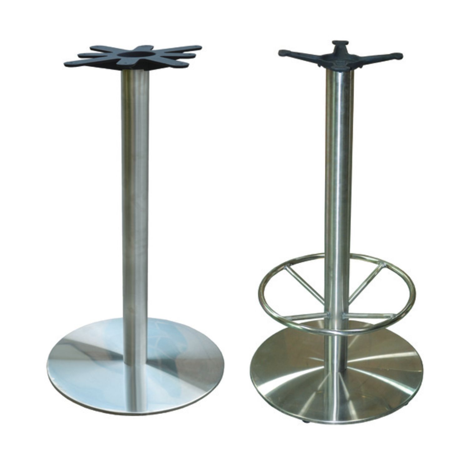 Stainless Steel Bar-height restaurant table bases, with or without a foot ring, from the Round Table Base line boast stylish domed bases with 5 points of contact. Crafted with a rounded bottom, the base optimally utilizes cast iron material in a smaller footprint, providing extra weight crucial for supporting tables of varying sizes— a feature not commonly found in comparable bases.