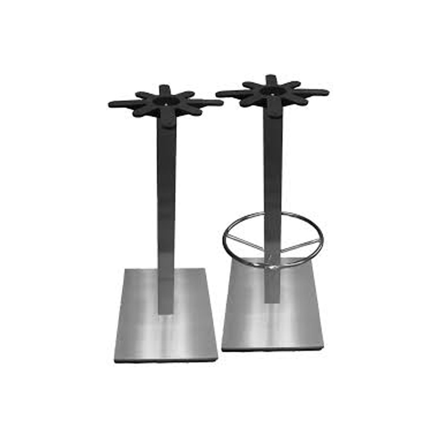 Stainless steel square bar height with square column. Both bar height and foot rail available. Base plate available in 18″ or 22″ square, #304 stainless steel. Includes 4 adjustable plastic glides.