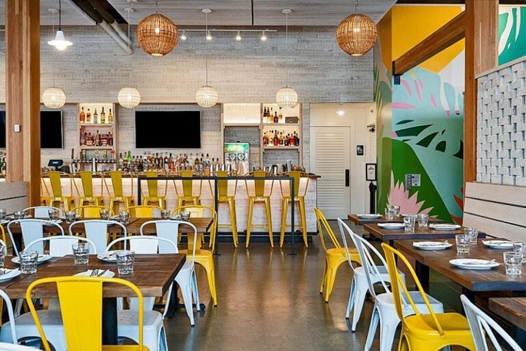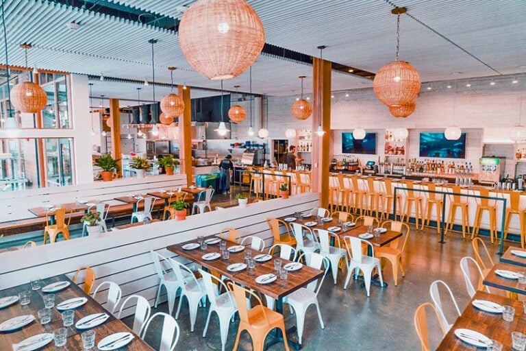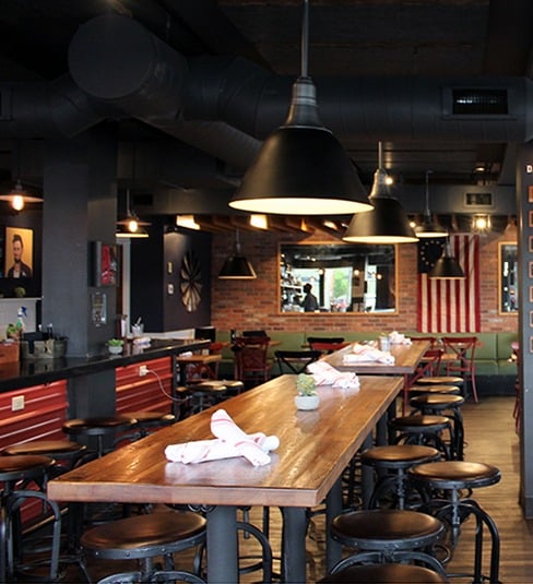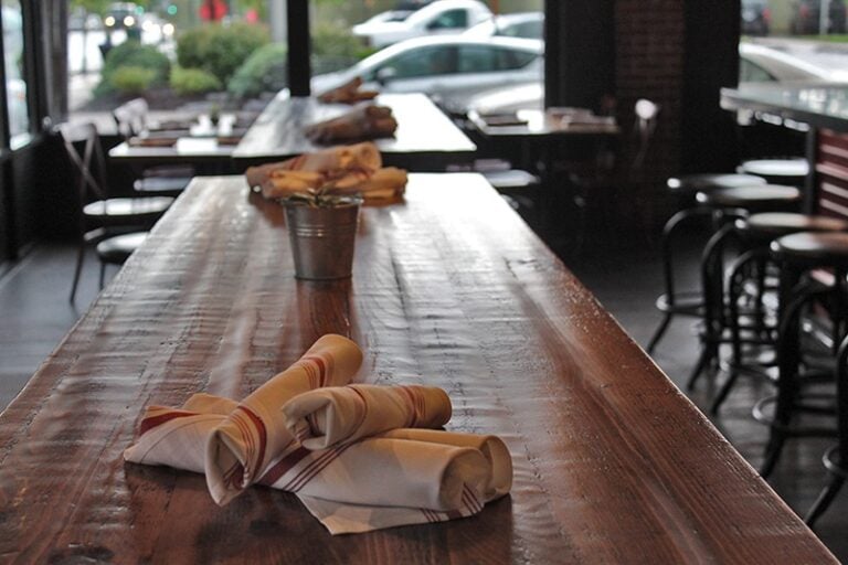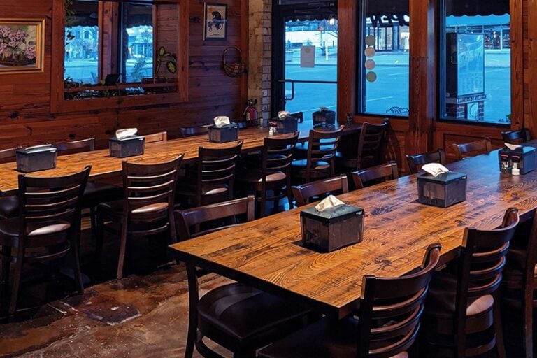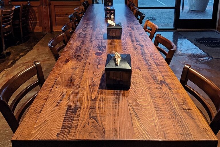 Our Rustic Patina Pine — Original tabletops start as authentic barn wood we carefully de-nail, kiln-dry, and select for character. The result is a warm, lively palette—straw to honey with occasional butterscotch streaks—crossed by historic circle-sawn signatures that read rustic yet refined in hospitality lighting. If you want to see how the tone shifts in daylight vs. evening, browse the installation gallery. We machine, flatten, and hand-sand each panel to keep the tactile story but deliver a smooth, cleanable surface. Every face and edge is sealed in our durable commercial finish with a low-sheen matte that stands up to busy turns and wipes down easily. For a deeper look at how we build—stock prep, glue-up, CNC surfacing, tone, multi-coat finish, and QC—visit the step-by-step process. Refining the concept? Compare this top in context with other species and constructions on the restaurant table tops overview. If you like the feel but prefer a brighter vibe, consider the sister finish, Rustic Patina Pine — White.