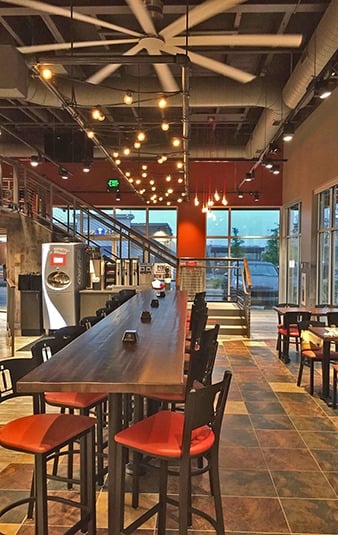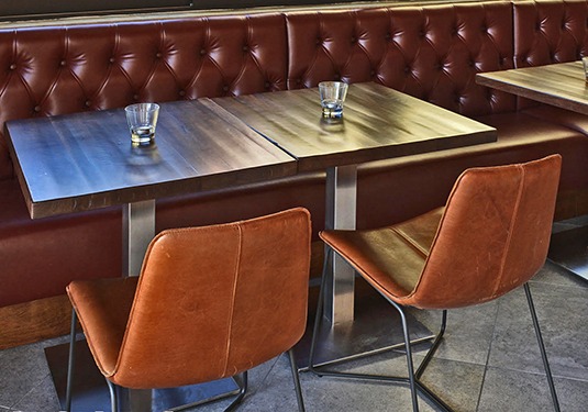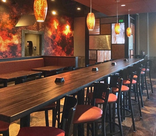 A calm, matte sheen keeps plateware crisp and photographs cleanly—useful when you need consistent visuals across locations. Because our finish system is durable and predictable, your commercial table tops hold their tone longer, reducing touch-ups and downtime. When the concept extends beyond the dining floor, carry the same Walnut story to coordinated wood bar tops so rail and dining feel like one idea.